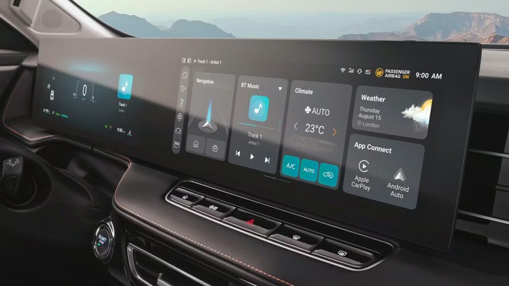 W centrum nowego MG HS Hybrid+ znajdują się dwa 12,3-calowe wyświetlacze – nowoczesny ekran dotykowy systemu infotainment oraz w pełni cyfrowy zestaw wskaźników, który prezentuje wszystko – od nawigacji po dane jazdy – z wyjątkową przejrzystością i stylem.